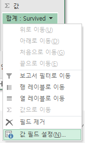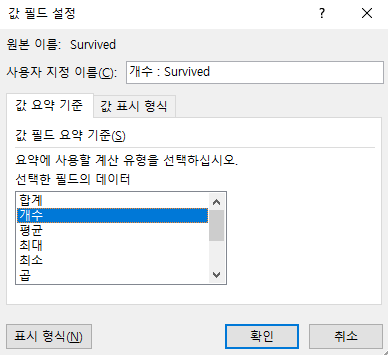 - 각 필드값 설정 - 합계 -> 개수