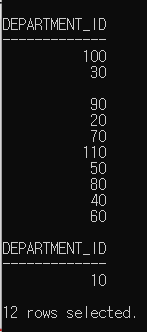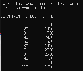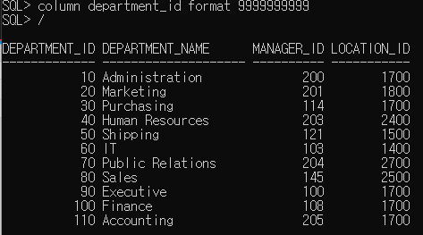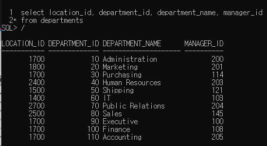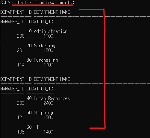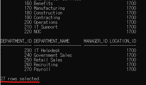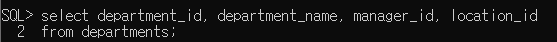 - 맨 상단에 컬럼 이름이 출력이 됨 : department_id, department_name, manager_id, location_id