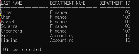 - 조건 : 조인조건, where 절에 반드시 조인 조건을 n-1개 만큼 작성해야함