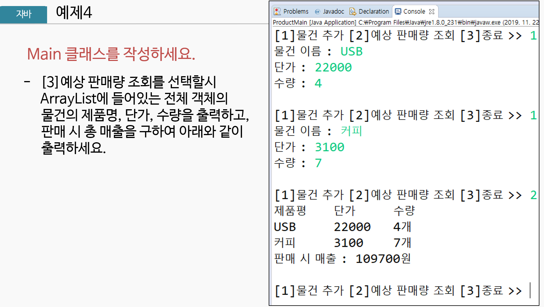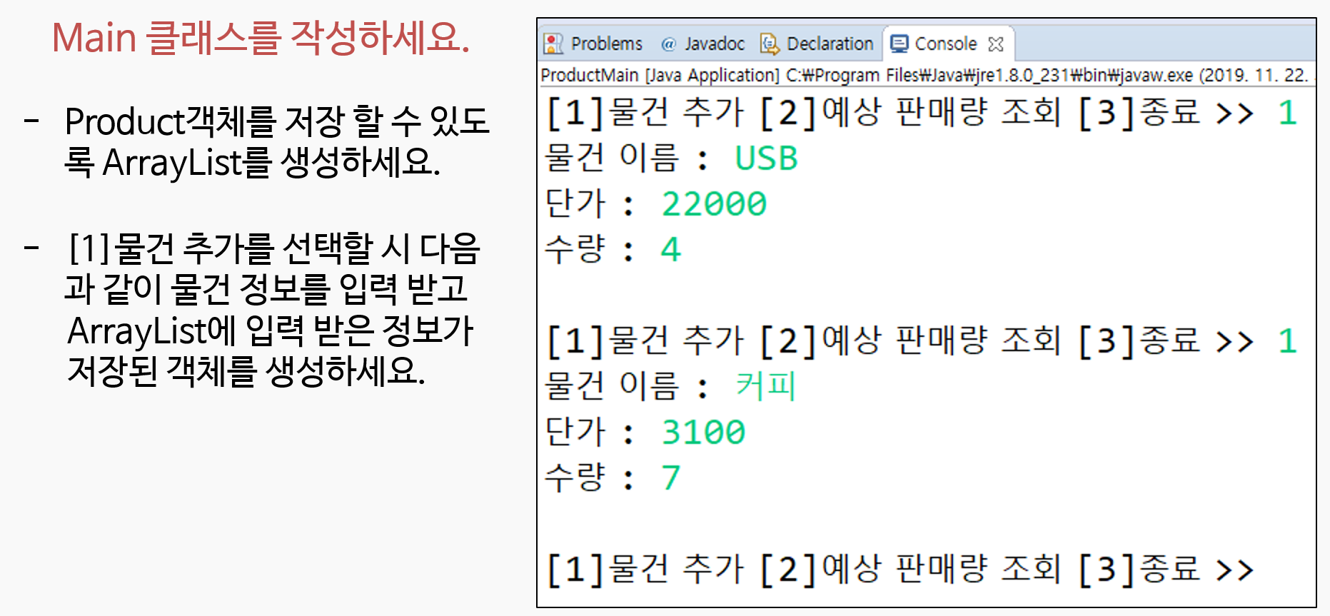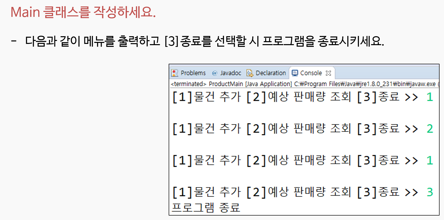System.out.print("[1] 물건추가 [2] 예상 판매량 조회 [3] 종료 >> ");